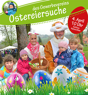 Die traditionelle Ostereiersuche des Gewerbevereins am Schloss Netzschkau war auch in diesem Jahr ein voller Erfolg. Unterstützt wurde der Gewerbeverein dabei von der Freiwilligen Feuerwehr Netzschkau und vielen freiwilligen Helfern. 400 Eier und zusätzlich über 400 Süßigkeiten warteten gut versteckt auf die fleißigen Sucher... Zusätzlichen Spaß gab es beim kostenlosen Ponyreiten, Eierlaufen, Sackhüpfen oder Dosenwerfen... Auch dieses Jahr war wieder der Osterhase mit seiner Osterhäsin dabei.